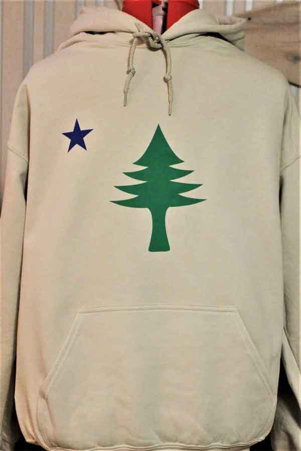 Old Maine flag Sweatshirt hand printed in Maine. Color is forest green 50/50 blend cotton/poly. If you are traveling to Maine, t-shirts and sweatshirts are also available at: Coles Corner in Wells Maine